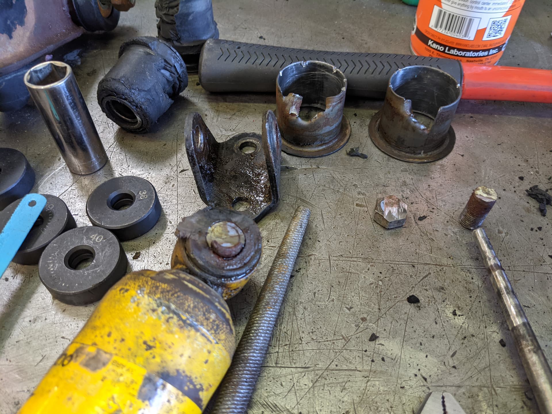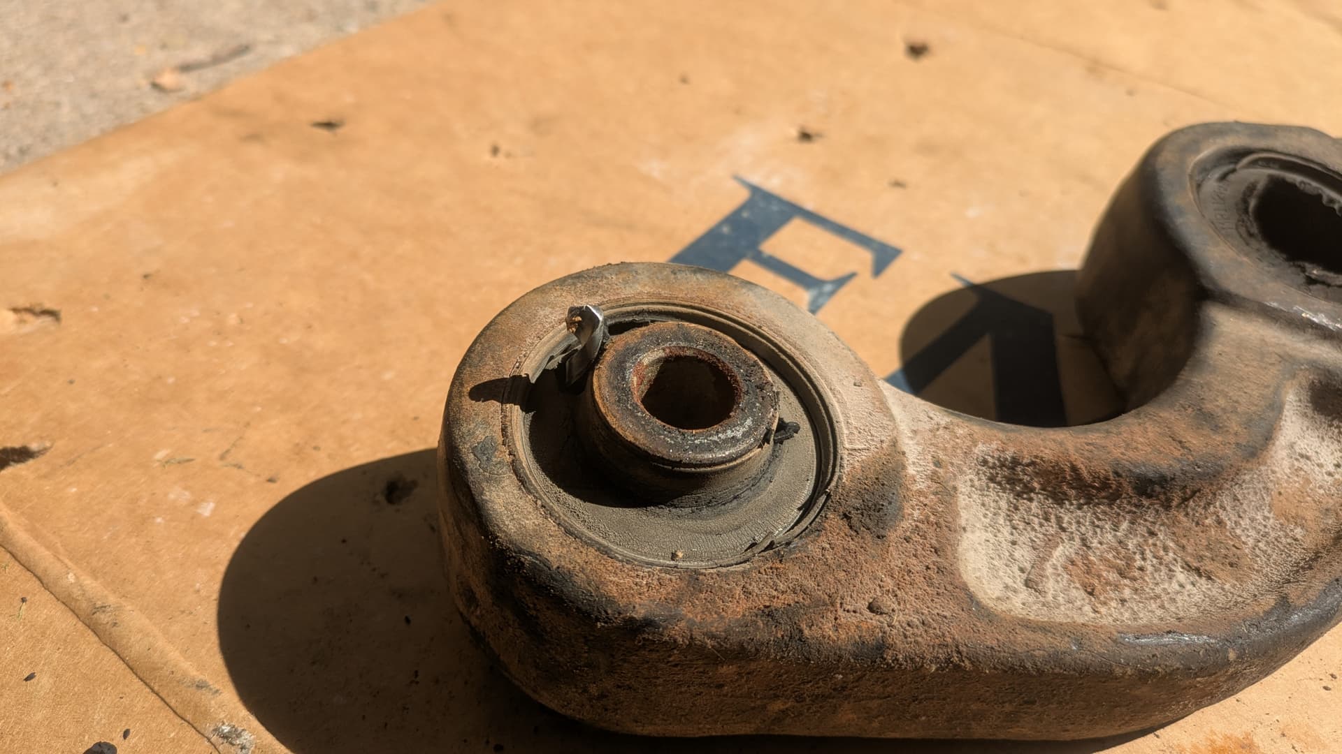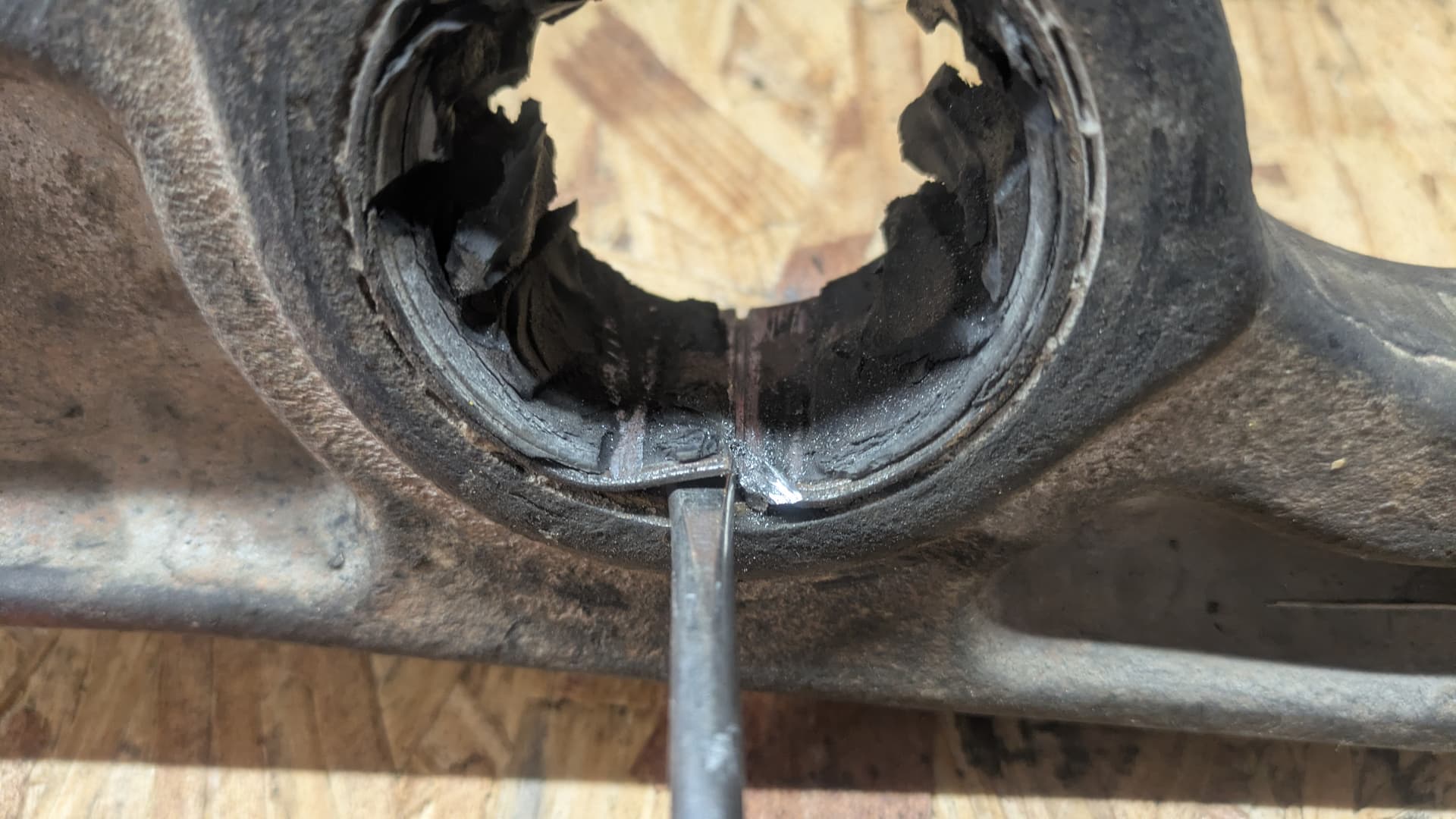 I’d started the project the weekend prior. Justin came over and we were stymied by a lack of leverage. After learning I could support the axle on jackstands to get bigger breaker bars in there, I got the driver’s side arm out the following afternoon. It took another day to remove the old bushings completely and prep the bores for replacements.