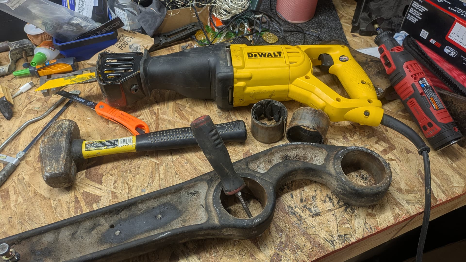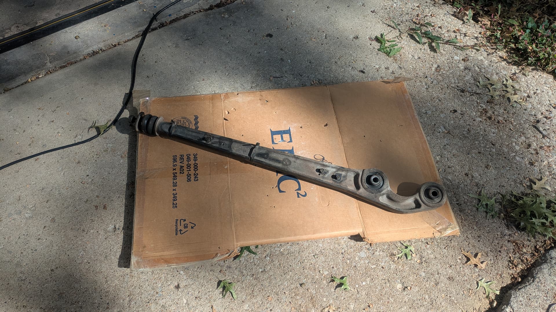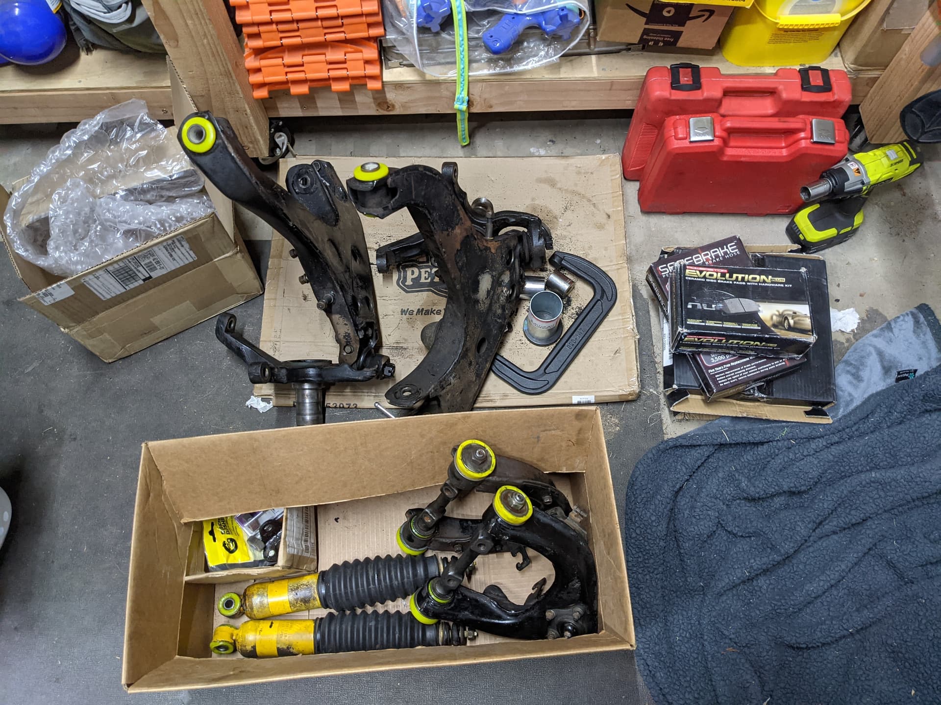 I’d started the project the weekend prior. Justin came over and we were stymied by a lack of leverage. After learning I could support the axle on jackstands to get bigger breaker bars in there, I got the driver’s side arm out the following afternoon. It took another day to remove the old bushings completely and prep the bores for replacements.
