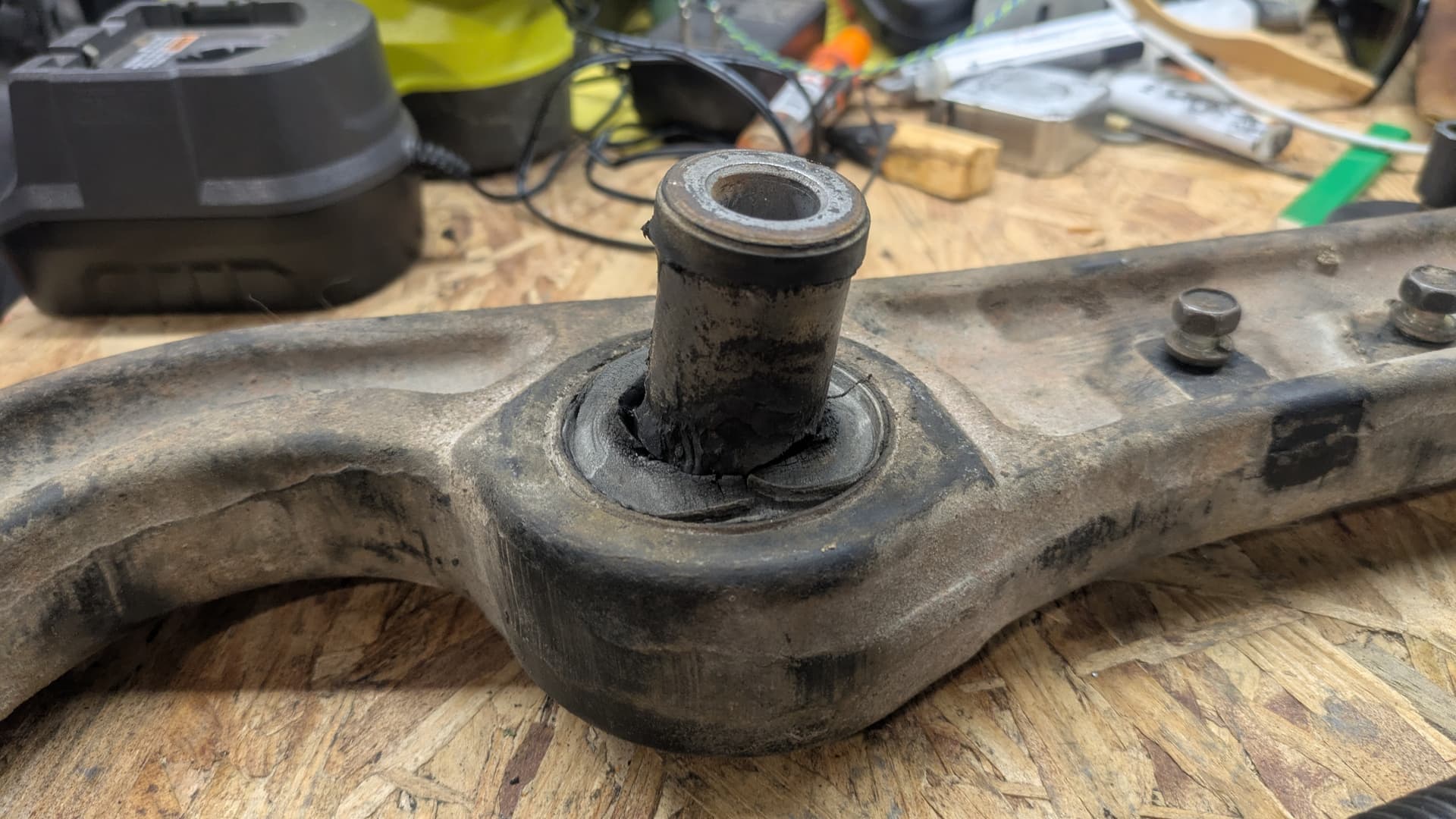 I’m staring at the filthy Montero trailing arm on my workbench, with a brand new eight-inch carriage bolt in-hand that’s just proven useless. It doesn’t fit my bushing press, I can’t turn back, and I’ve got 24 hours to get Fezzik back on the road for birthday carpool duty.